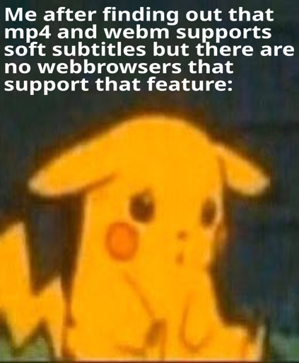 einfach_orangensaft@sh.itjust.works to Programmer Humor@programming.dev · 11 months agoWebm supports multiple audio and subtitle tracks inside its RIFF container structure, why the hell arent browsers supporting it???sh.itjust.worksimagemessage-square29linkfedilinkarrow-up1549