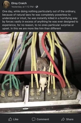 I gutted a room and inside a wall cavity found a fully intact mouse skeleton with a wire cap stuck in it’s mouth