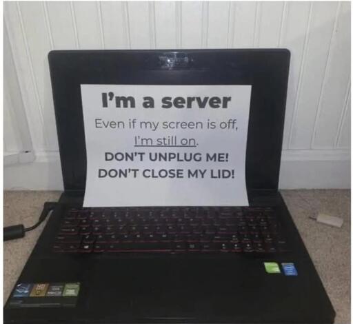 Let’s face it, the place using a laptop on the floor with a paper sign probably doesn’t have the budget for real sysadmins. At the same time, most real sysadmins know to disable the lid-closing behavior and get the laptop off of the carpet because they’ve been foiled in their past by people who refused to read the goddamn paper sign.