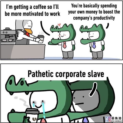 Let’s start at wake up time. Assuming you’re a normal person and get up a few hours before work, so that you can go to work, and assuming you work in an office, and you commute there… You get up, have a coffee, that you paid for yourself, so you can be awake enough to get to work and be productive. You clean up, so you are visually appealing, or at least not visually repulsive, and put on clean clothes that you spent your own time and money to make clean. Now that you are energized, clean, dressed and presentable, you then get into the car you bought with your own money, to spend gasoline that you pay for (or electricity, if you’re an EV owner), to propel yourself to your companies office. You do this, every day. Hours a day of unpaid work, out of your own pocket, in service of the company, all before you do one thing that might actually generate revenue for the business.