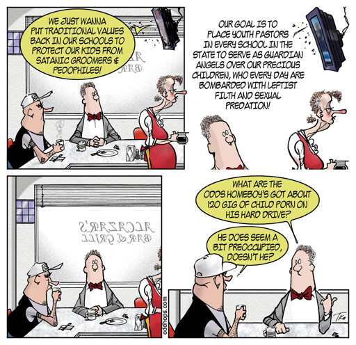 I’m more interested in why this comic alleges a youth pastor of something so gross as having CSAM on his device. That’s not a lighthearted or funny accusation.